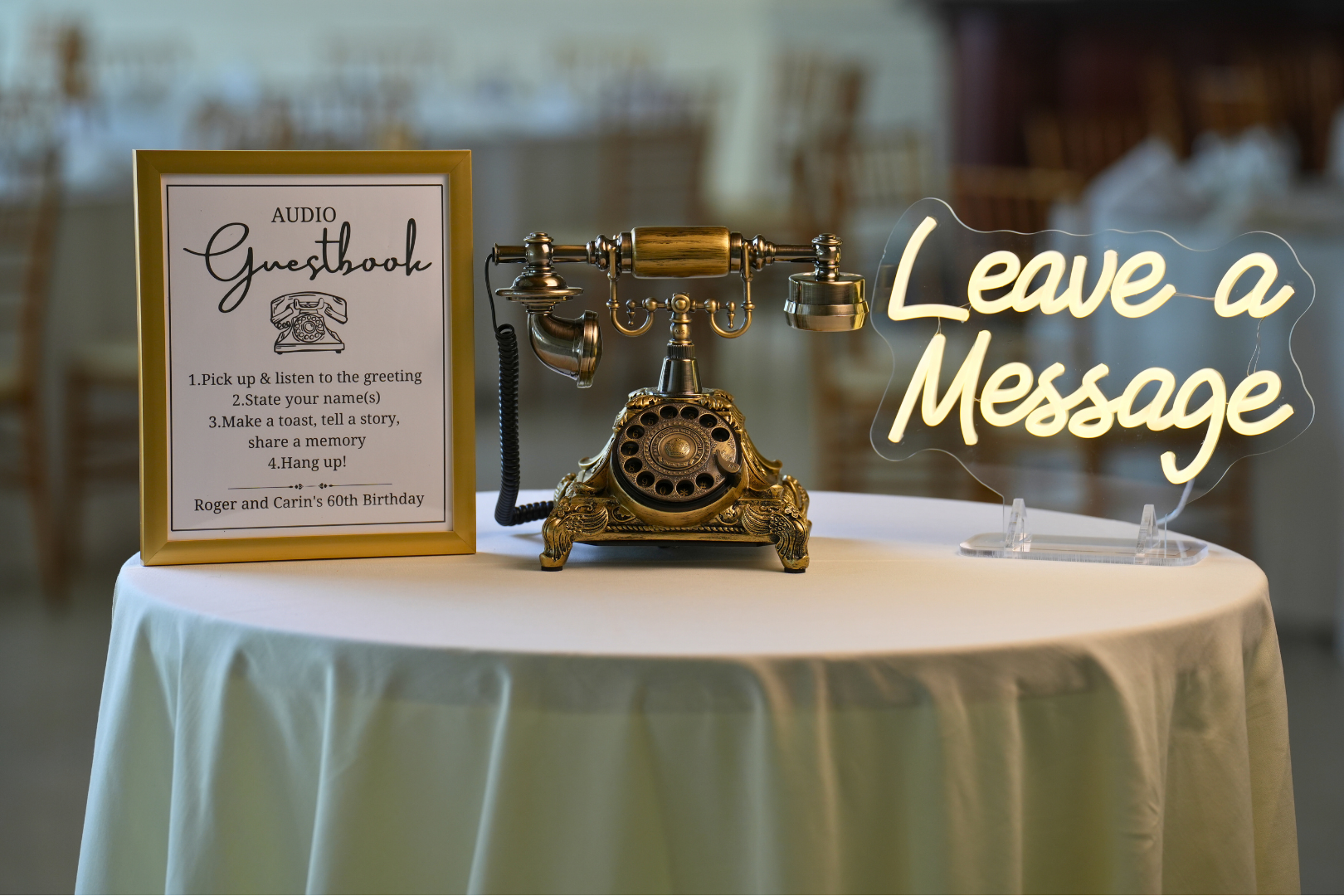 Our curated collection of vintage-style audio guestbook phones, elegant instruction frames, and signature neon “Leave a Message” signs are designed to elevate any event.